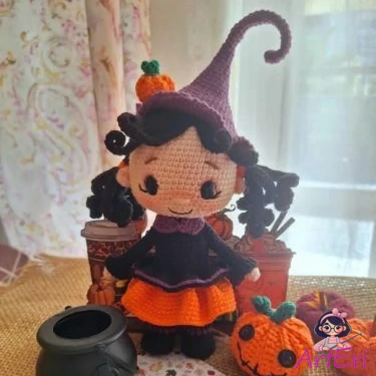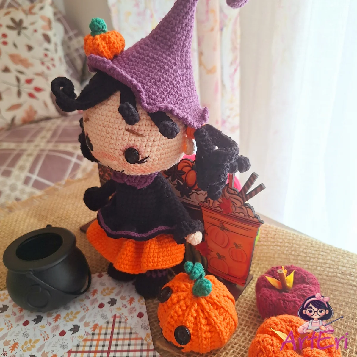 Χειροποίητη πλεκτή κουκλίτσα μάγισσα με πολλές λεπτομέρειες πάνω της ,με ένα μεγάλο μωβ καπέλο και την κολοκύθα της για παρέα!