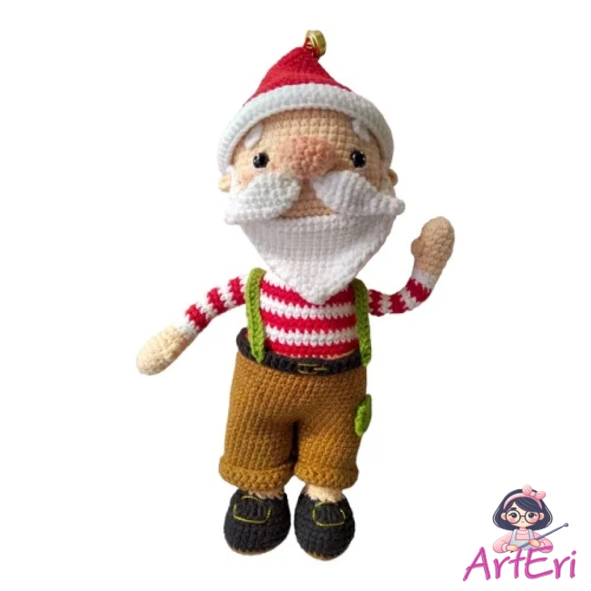 Χειροποίητος πανέμορφος Άγιος Βασίλης, με πολλές λεπτομέρειες, με χέρια που λυγίζουν, φτιαγμένος με κατάλληλα νήματα για παιδιά! Φοράει παντελόνια με τιράντες που βγαίνει και σκούφο κόκκινο με κουδουνάκι χρυσό