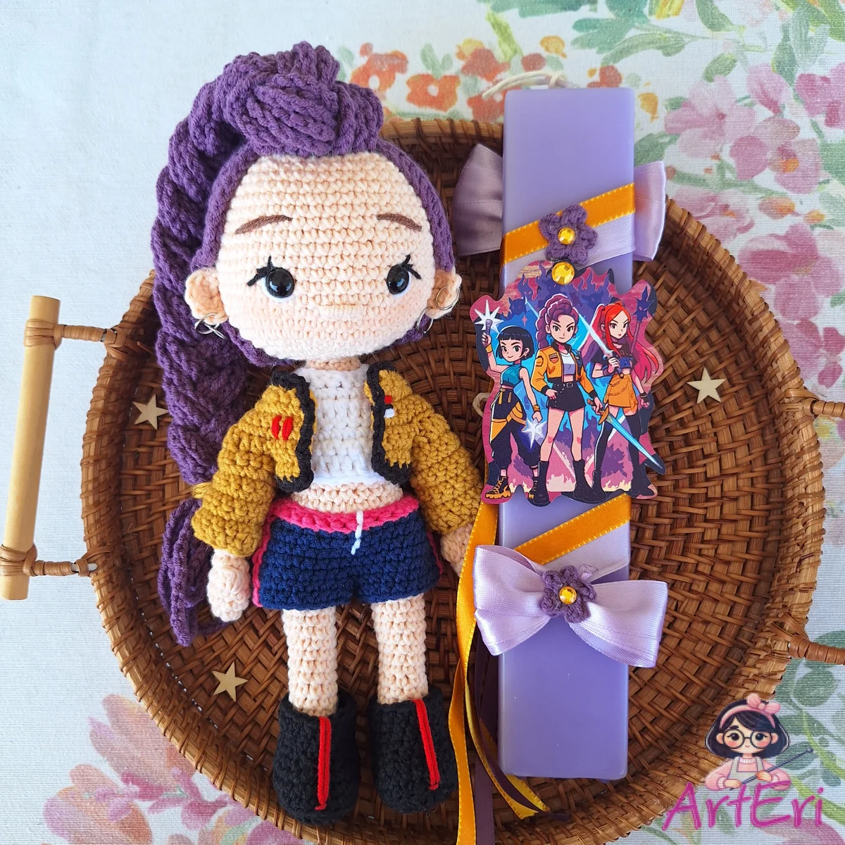 Χειροποίητη πλεκτή κούκλα Ρούμι με ρούχα που βγαίνουν και συνοδεύεται από λαμπάδα αρωματική πλακέ μωβ στολισμένη