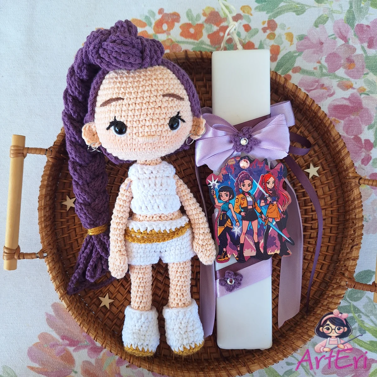 Χειροποίητη πλεκτή κούκλα Ρούμι με τα λευκ της ρούχα που βγαίνουν και συνοδεύεται από λαμπάδα αρωματική πλακέ λευκ στολισμένη