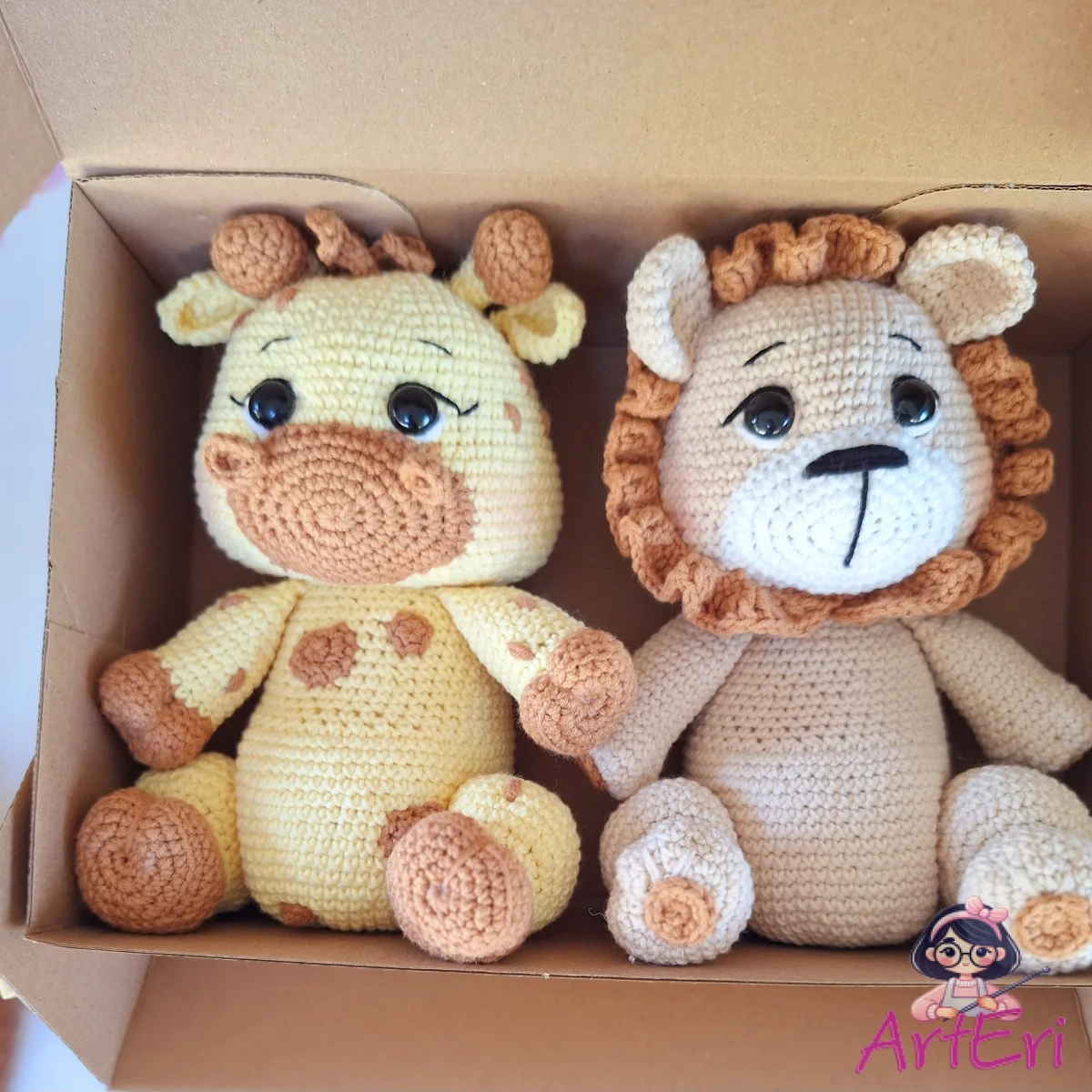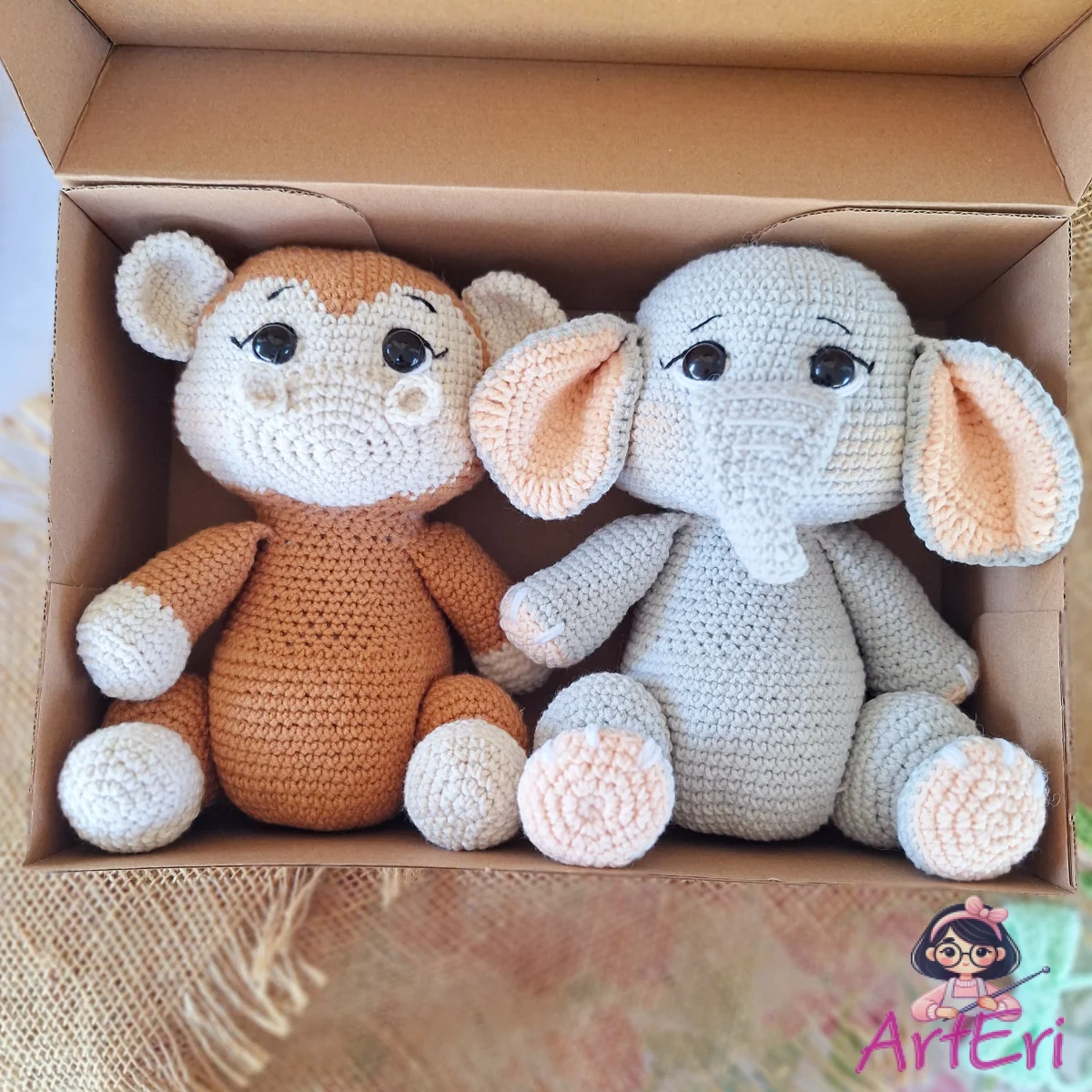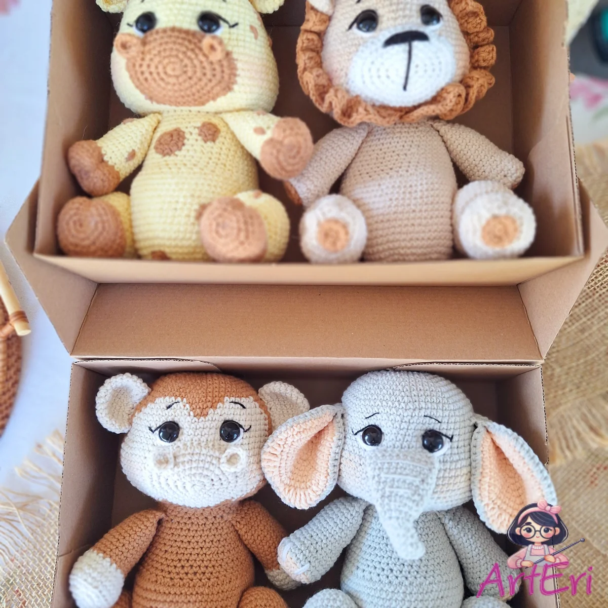 Ένα μοναδικό χειροποίητο σετ που αποτελείται από 4 ζωάκια της ζούγκλας λιοντάρι καμηλοπάρδαλη-μαϊμουδάκι-ελεφαντάκι φτιαγμένα απο απαλα νήματα κατάλληλα για παιδιά