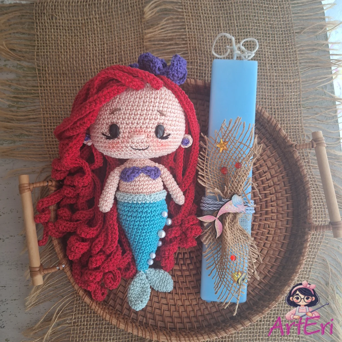 Χειροποίητη πλακε αρωματική λαμπάδα που συνοδεύει τη μικρή γοργόνα φτιαγμένη με τα καλύτερα βαμβακερά νήματα και πολλές λεπτομέρειες