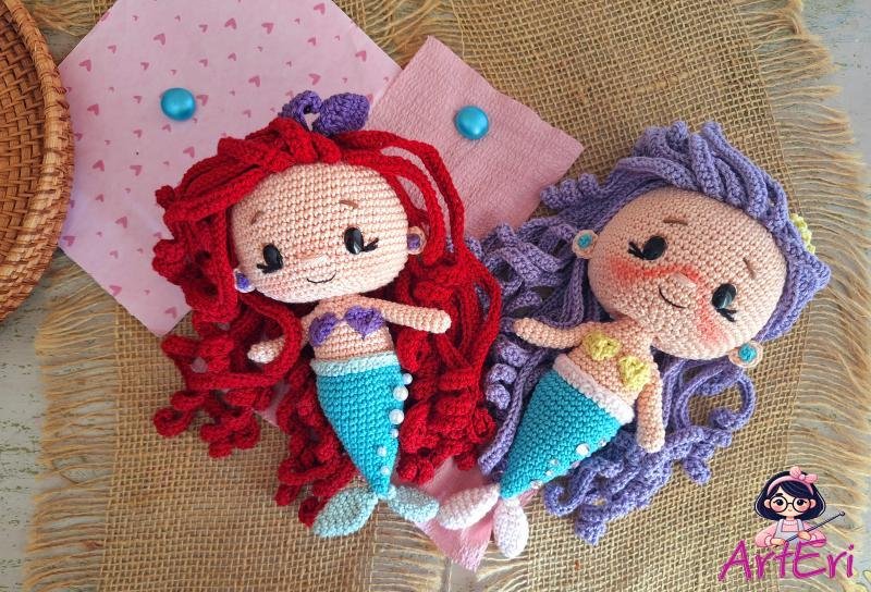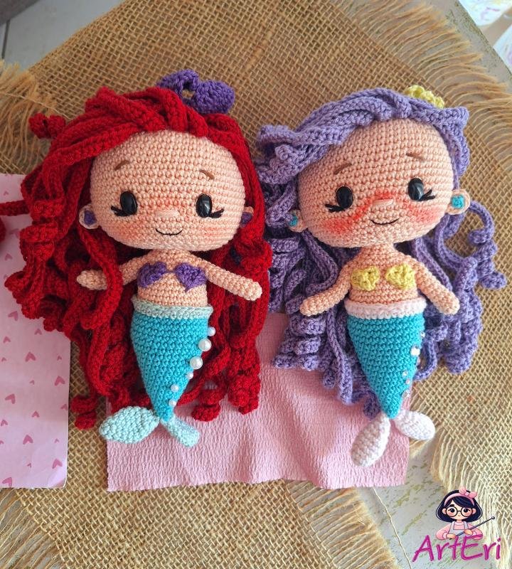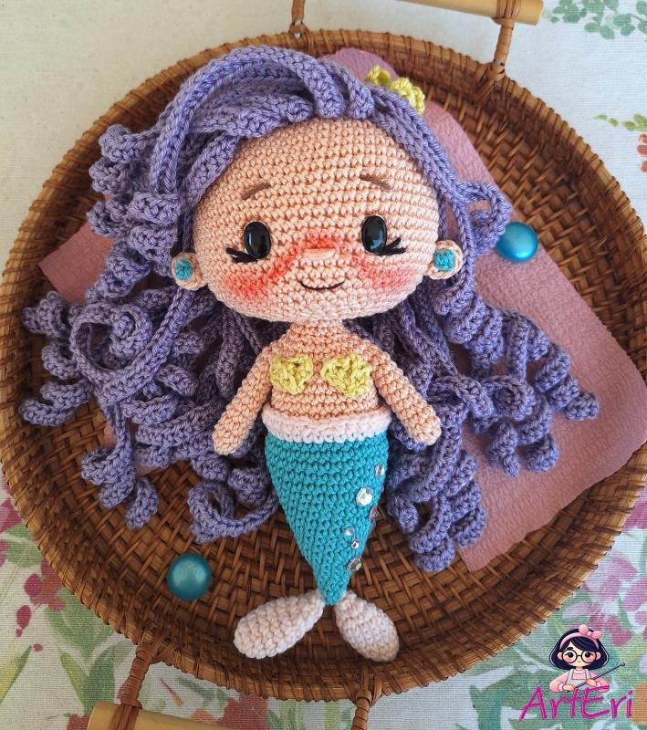 Χειροποίητη πλεκτή κουκλίτσα γοργόνα Βιολέτα φτιαγμένη με 100% βαμβακερά νήματα κορυφαίας ποιότητος με ιδιαίτερα οβάλ ματάκια και πλούσια μαλλιά