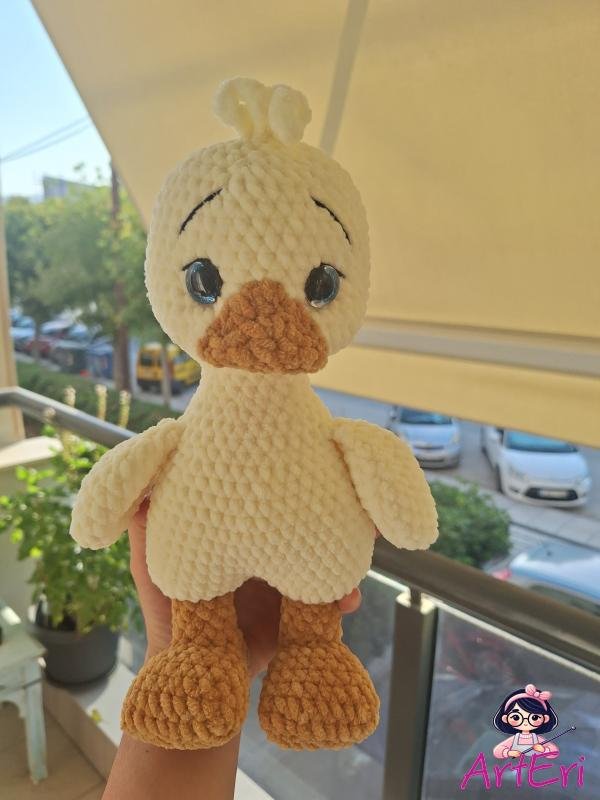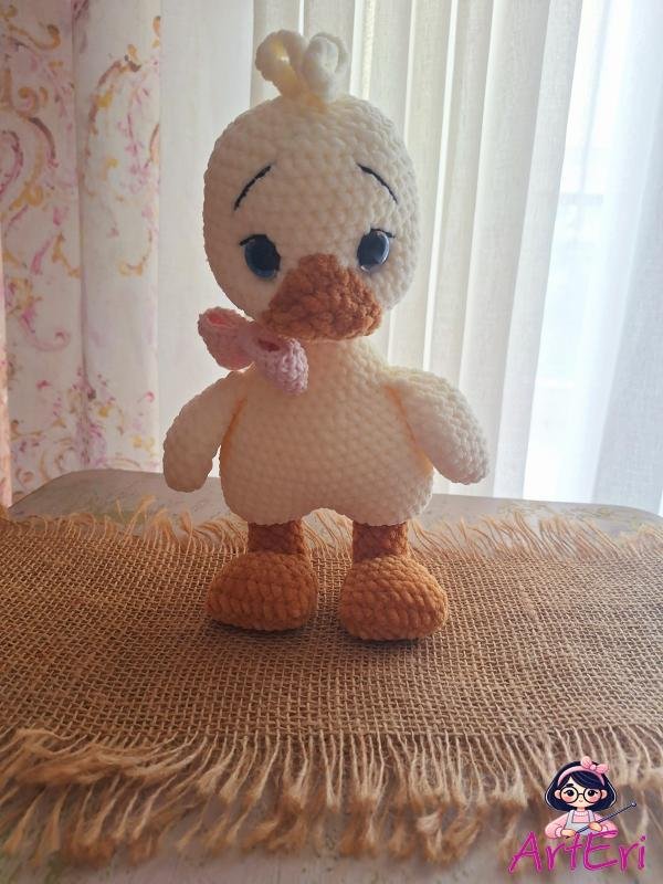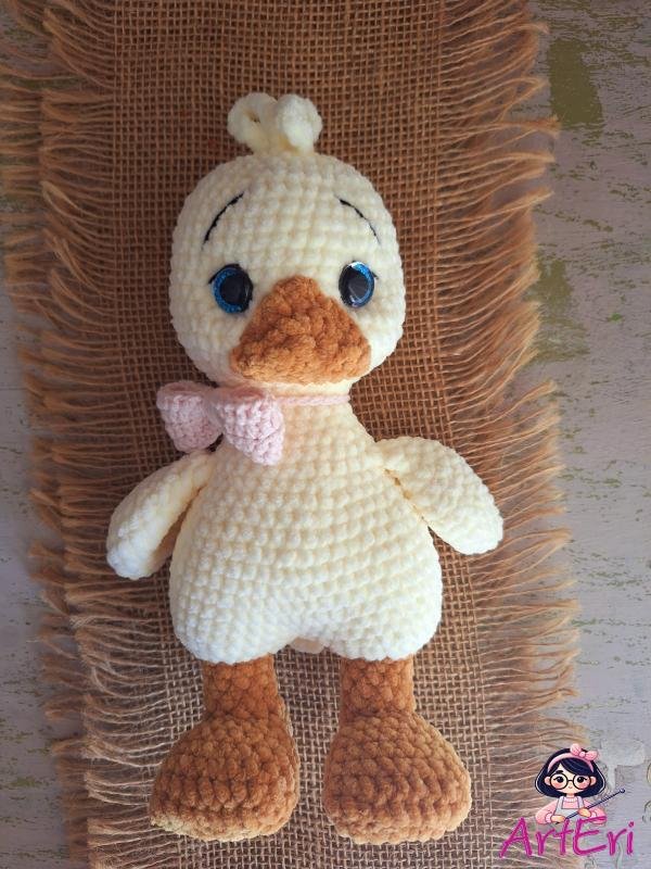 Πανέμορφο πλεκτό παπάκι φτιαγμένο με απαλό βελούδινο νήμα και 3D γαλάζια ματάκια καθως και φιόγκο στο χρώμα της επιλογής σας
