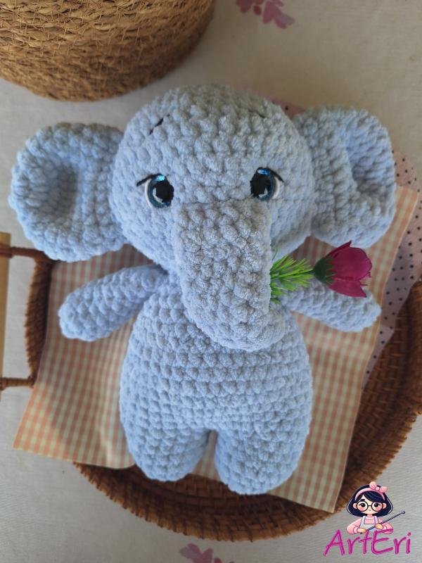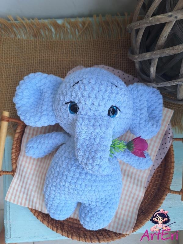 Ένα υπέροχο χειροποίητο ελεφαντάκι έρχεται για να κλέψει καρδιές με τα γαλανά του ματάκια και την απαλή του υφή!Φτιαγμένο με βελονάκι και χοντρό βελούδινο νήμα καταλληλο για μωρά