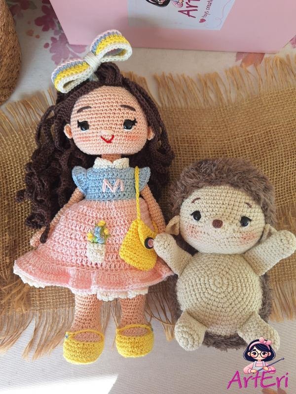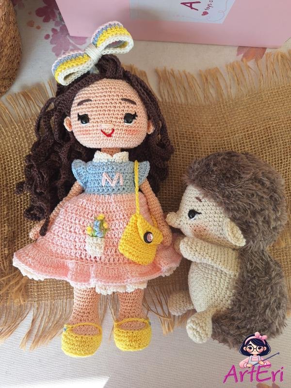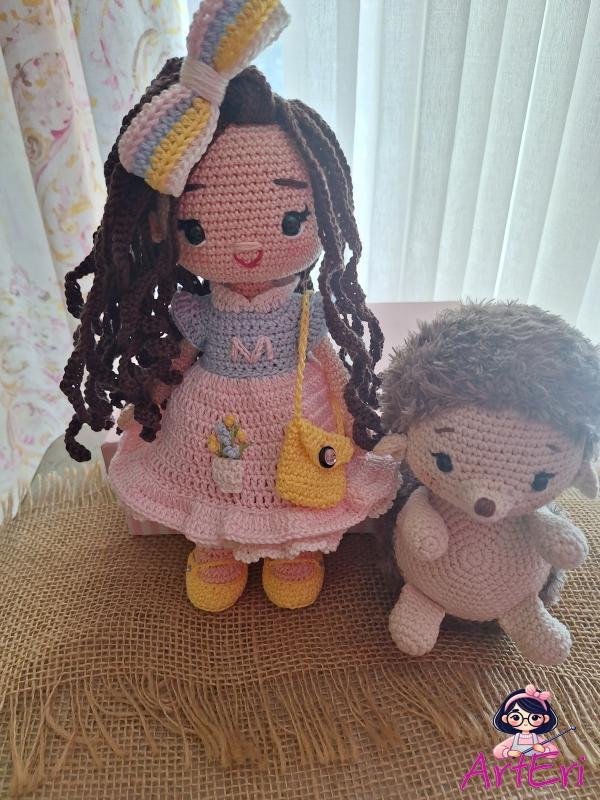 Προσωποποιημένη πλεκτή κούκλα με πολύ μακριά μαλλιά και πολλές λεπτομέρειες,φτιαγμένη με τα καλύτερα 100% βαμβακερά νήματα